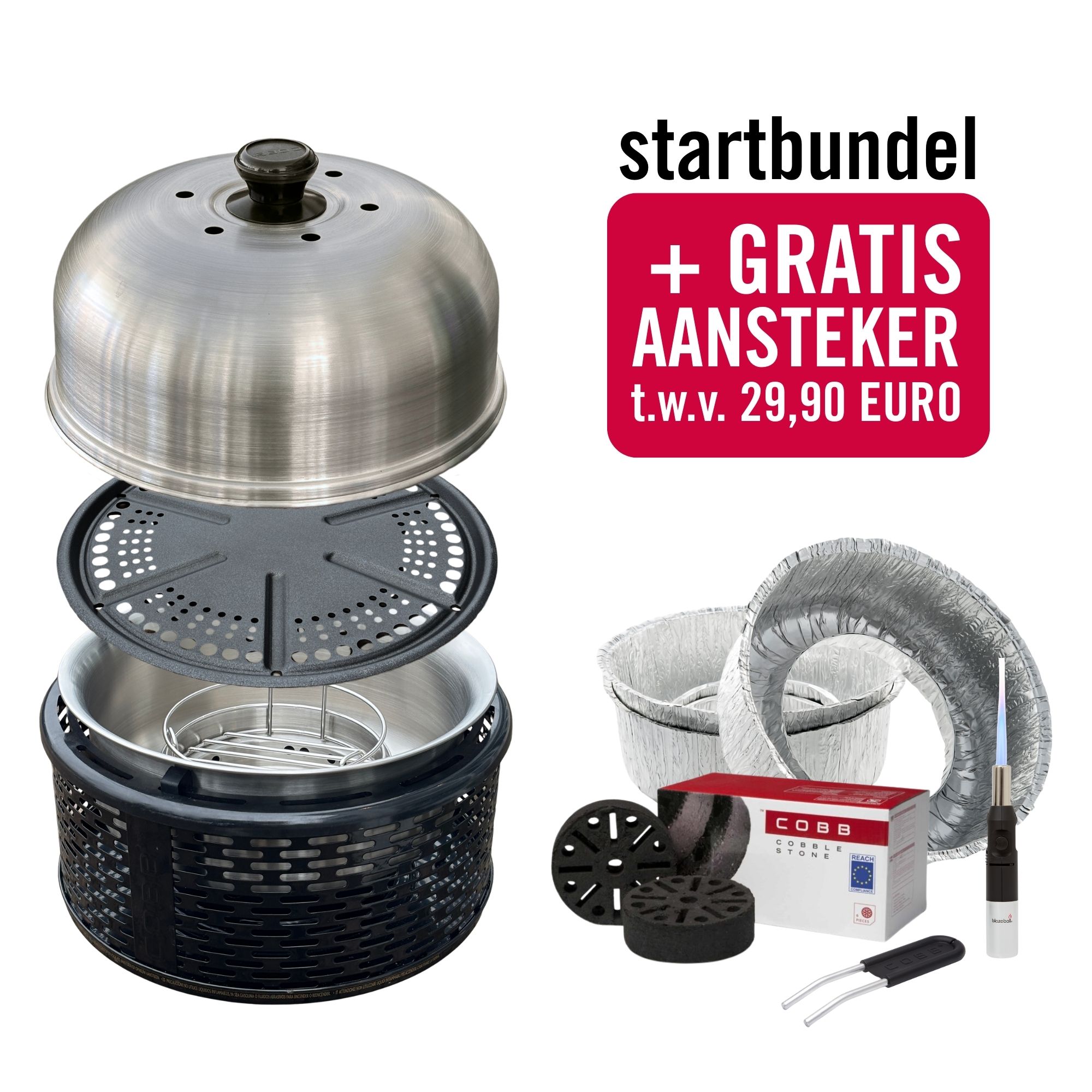 Met deze bundel heb je meteen alles in huis om zorgeloos aan de slag te gaan. Je ontvangt de COBB Pro barbecue samen met CobbleStone briketten, wegwerpkommen en een gratis krachtige JetFlame aansteker t.w.v. €29,90.