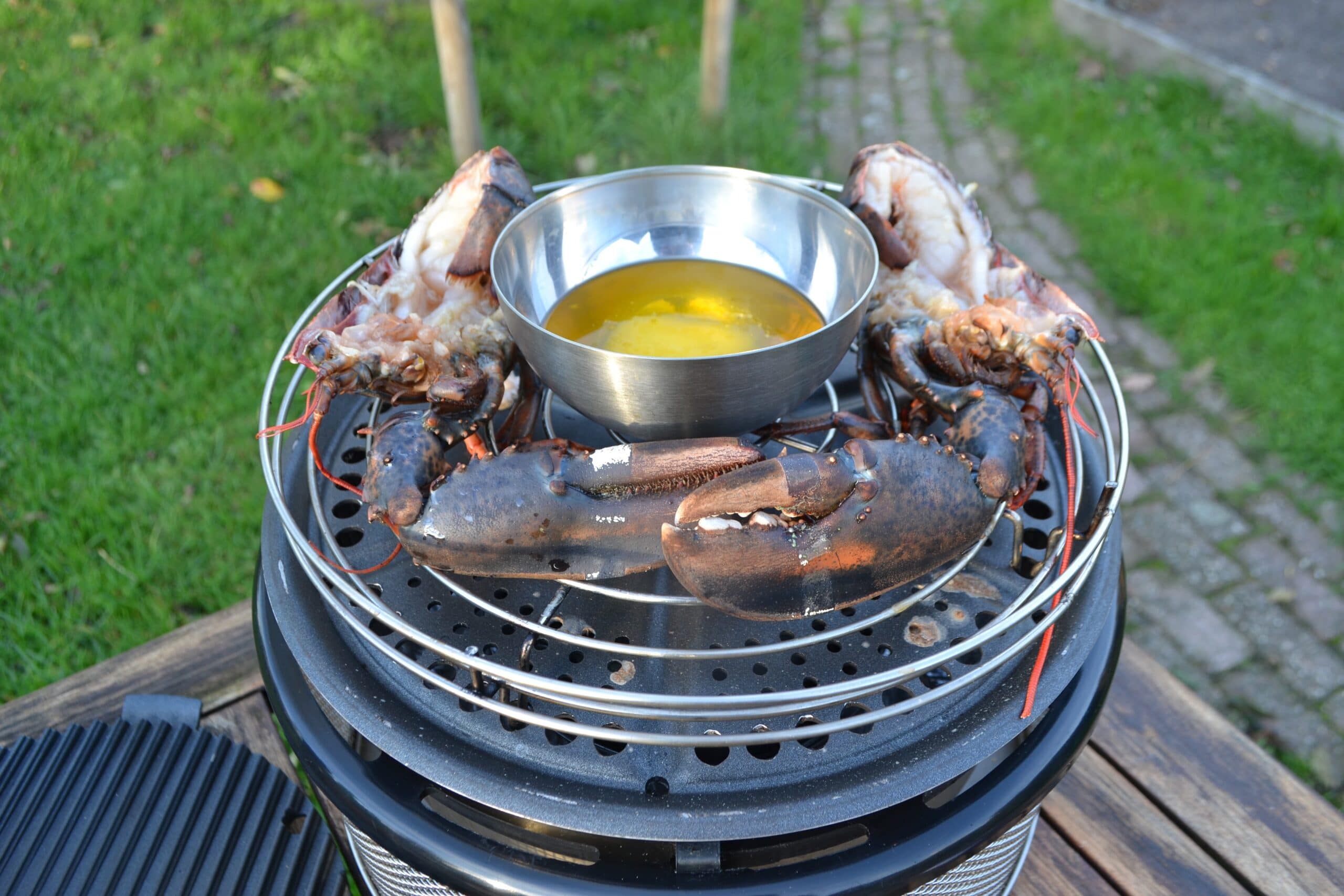 Na tien minuten mag het deksel weer van de COBB. De halve kreeften zijn een beetje opgekruld en als het goed is, is je boter gesmolten.
